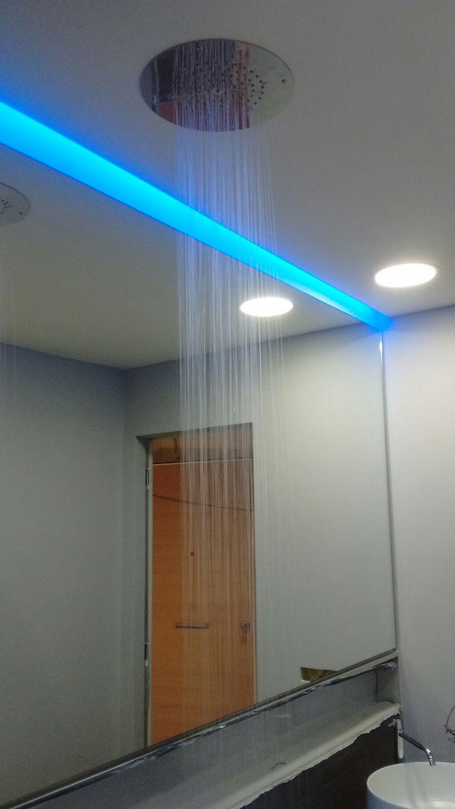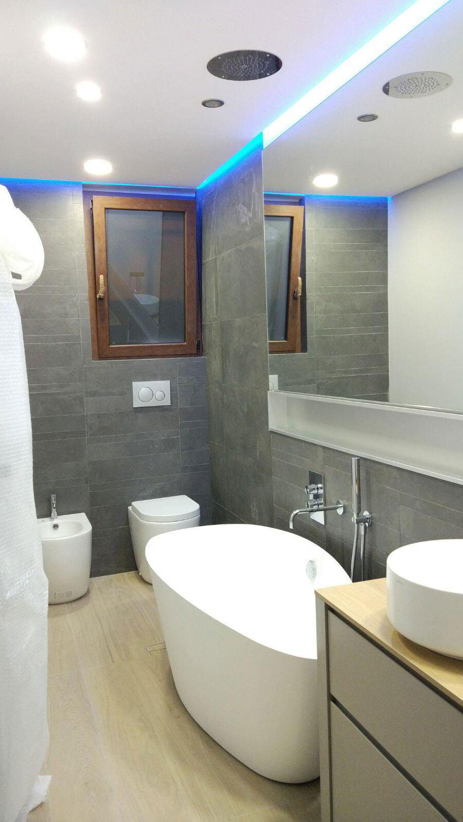 Fourniture : Robinets Gessi Via Tortona, pommeau de douche Bossini monté au plafond, revêtement gris Abk Docks, mobilier Compab.