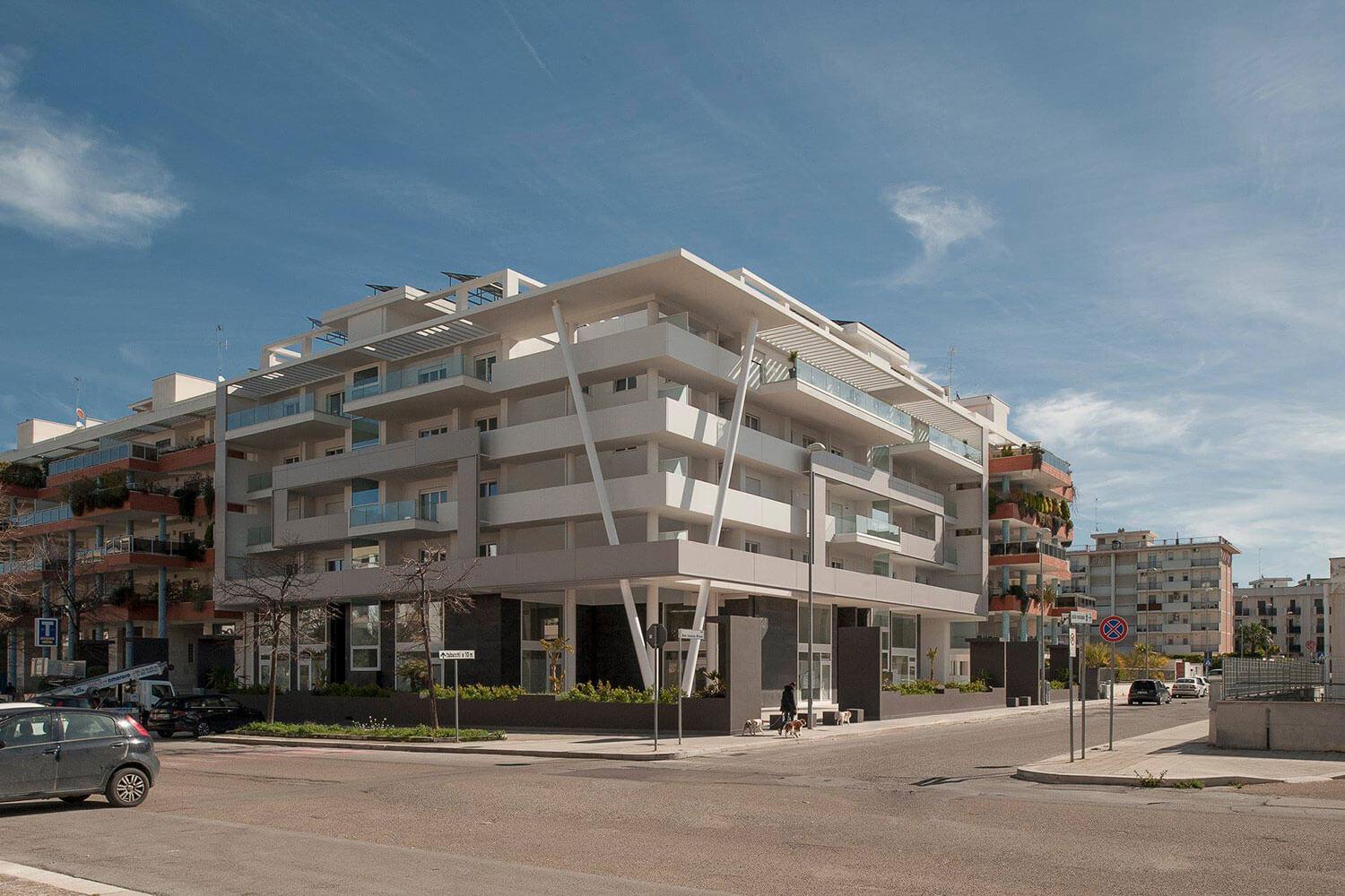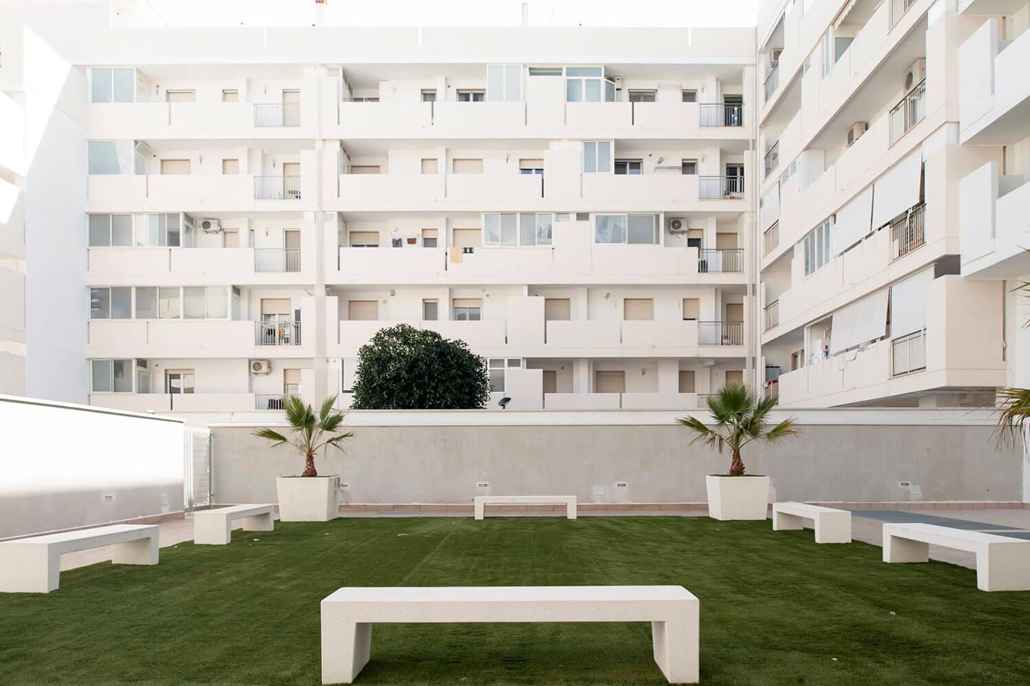 En particulier, le rez-de-chaussée à double hauteur est destiné à des activités commerciales donnant sur deux boulevards piétonniers, avec des équipements verts urbains et des bancs et de vastes parkings au niveau public avec un parc dans la cour. Volumes, porte-à-faux, grandes fenêtres et balcons en terrasse avec une forte présence de verdure permettent de vivre l'intimité de la villa en appartement.